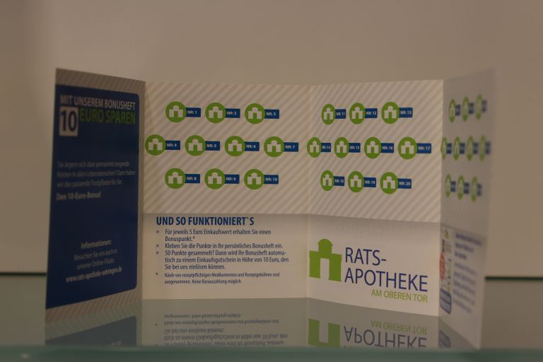 Für jeweils 5 Euro Einkaufswert erhalten Sie einen Bonuspunkt (Käufe von rezeptpflichtigen Medikamenten und Rezeptgebühren ausgenomen. Keine Barauszahlung möglich.